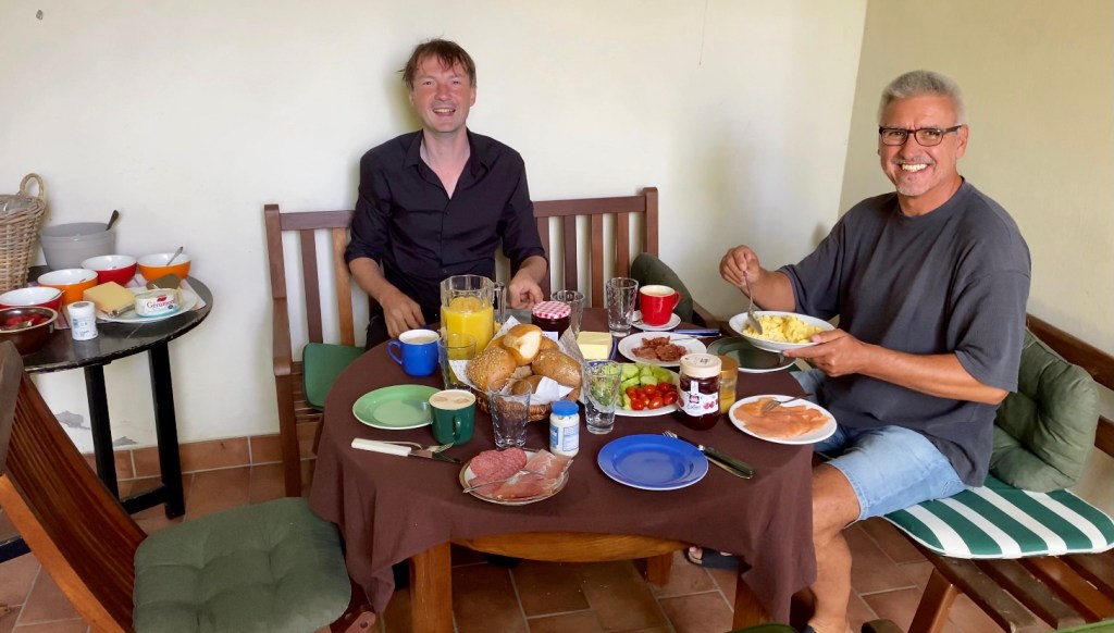 Kurz vor dem Abschied von den Beiden, stieß unser lieber Freund und Helfer Sascha zu uns. Da er uns schon auf der Testfahrt im März begleitet und unterstützt hatte, freuen wir uns, dass er uns jetzt auch wieder einen ganzen Tag begleiten wird. Vor allem, da Andreas und ich jetzt, abwechselnd auf das Rad von Sascha steigen können und Sascha mal einen Tag lang, auf dem Rücksitz des Tandems Schwerstarbeit leisten kann 😄. Als ich vorhin das erste mal sein Fahrrad übernehmen durfte, dachte ich im ersten Moment, dass er einen E-Antrieb am Rad hat. Wahnsinn, Fahrräder fahren ja eigentlich von allein. Ich hoffe Andreas kommt heute erst ganz spät auf den Gedanken, mit mir zu tauschen 😅.