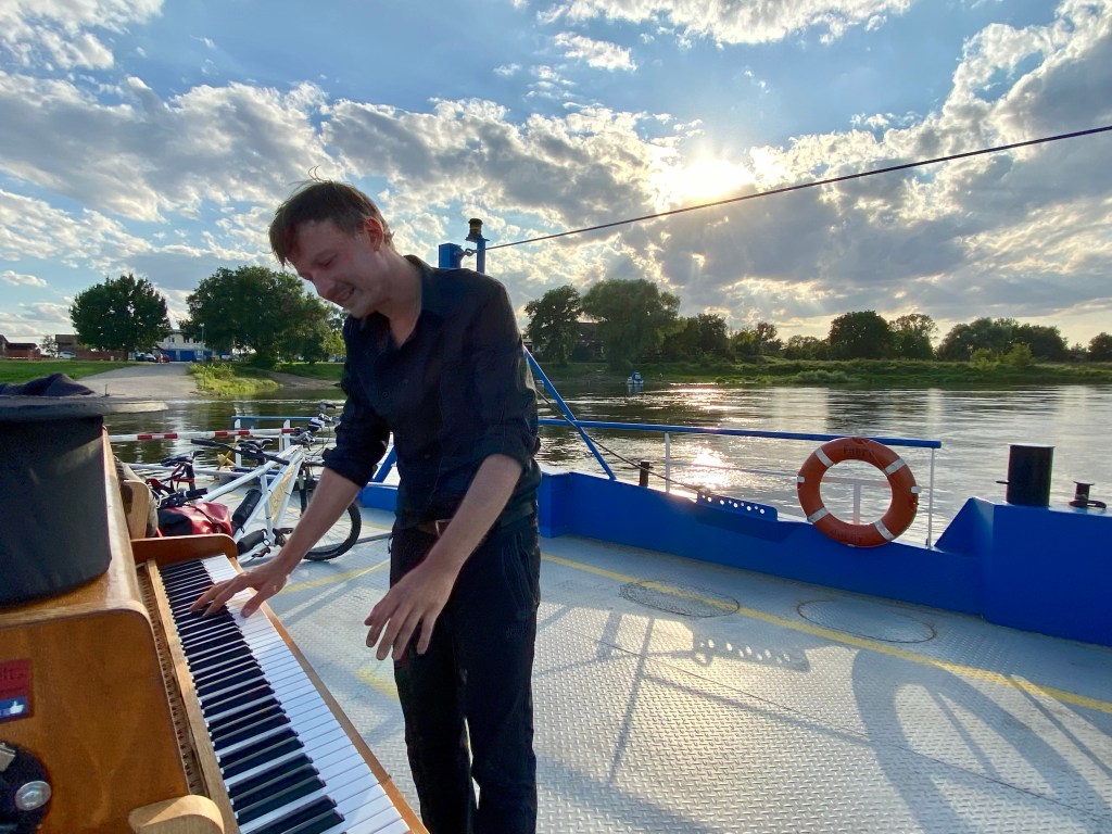 Jetzt sind wir wieder auf der rechten Seite der Elbe und haben es mal wieder geschafft die Überfahrt kostenlos zu bekommen und ein paar Leute mit dem Gefühl zurückzulassen, heute etwas besonderes erlebt zu haben. In Aken haben wir eine lange Pause gemacht, die Gabel des Hängers nachgezogen und mit unseren Familien telefoniert. Nach einigen Leckerbissen, die von unserem gestrigen Großeinkauf noch völlig unangetastet waren, fuhren wir wieder einmal über die Fähre, die wir erfolgreich mit Musik bezahlen konnten und zusätzlich einiges im Hut gelandet ist.